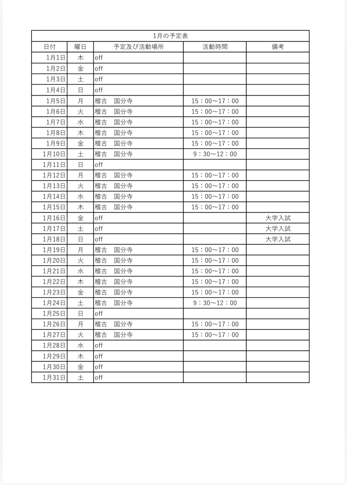 年内の稽古は無事終了しました。お疲れ様でした。来月1月の予定表です。よいお年をお迎えください。